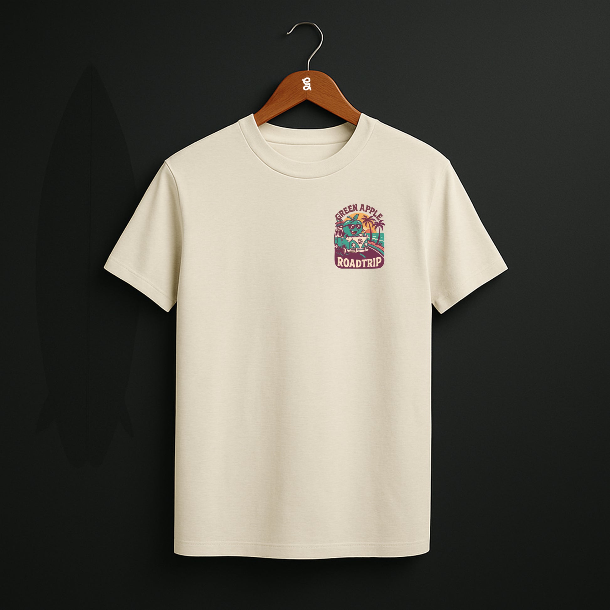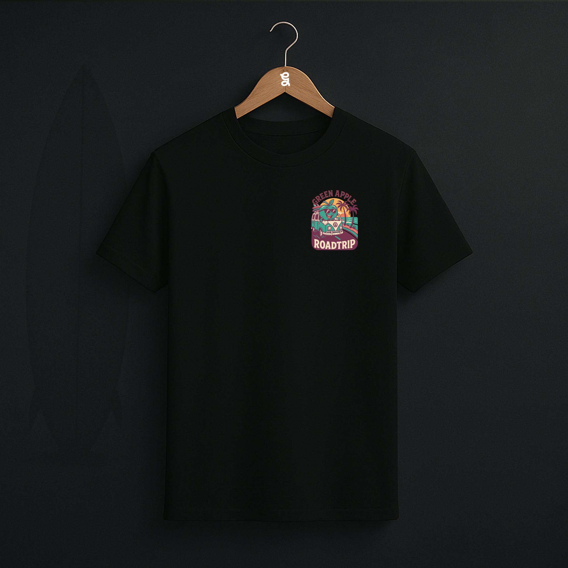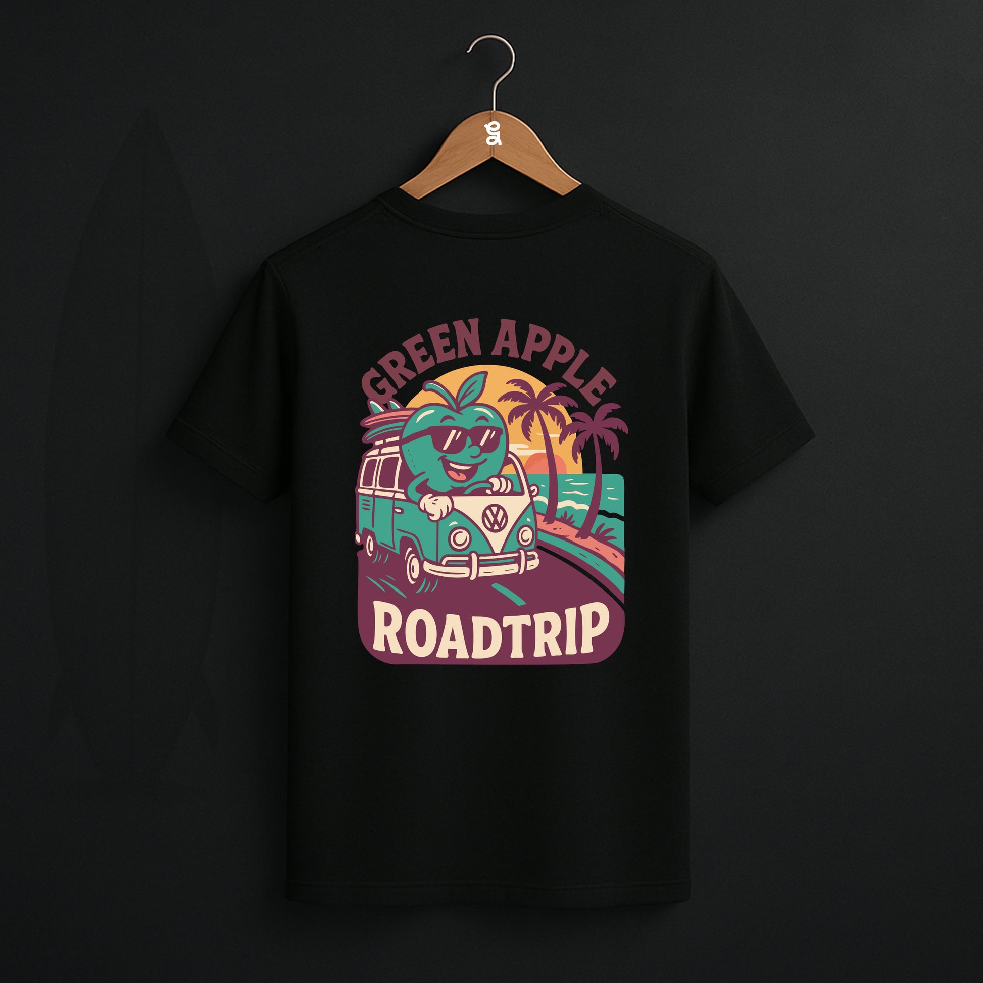 Inspired by the laid-back energy of Road Trippin’ by the Red Hot Chili Peppers, this tee captures the spirit of freedom, good company, and open roads. Featuring our apple mascot cruising a classic VW van by the ocean with boards on top and palms in the background, it’s all about adventure and good vibes.